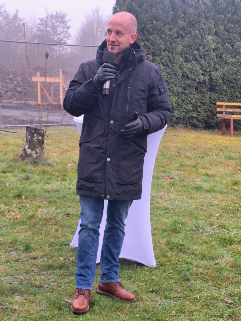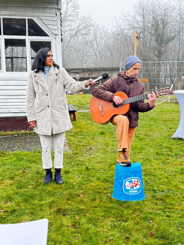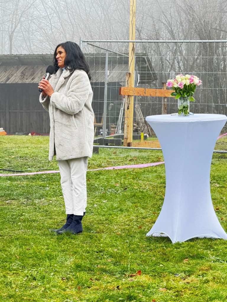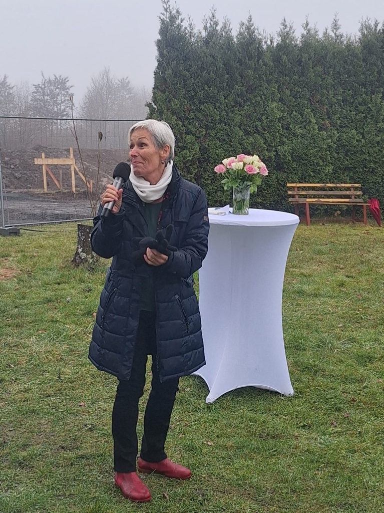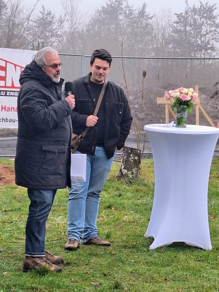 Nach der Begrüßung durch unsere Vorstandsvorsitzende, Dr. Binytha Raabe, mit Informationen zum Hintergrund dieses gemeinnützigen Bauprojektes folgten herzliche Reden von Bürgermeister Brasch und Bettina Müller. Ihre Worte waren sehr berührend für uns – man spürte Freude und Wertschätzung für unseren Ort der Meditation. Anschließend stellten die Architekten das Projekt vor, und gemeinsam wurde ein Lied gesungen – ein besonders schöner Moment der Gemeinschaft.