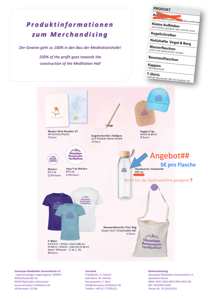 Der gesamte Erlös dieser Produkte fließt zu 100 Prozent in unser gemeinnütziges Projekt – den Bau einer Meditationshalle am Ort der Meditation in Bad Soden-Salmünster.