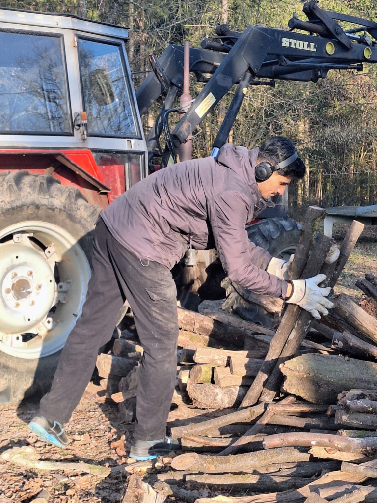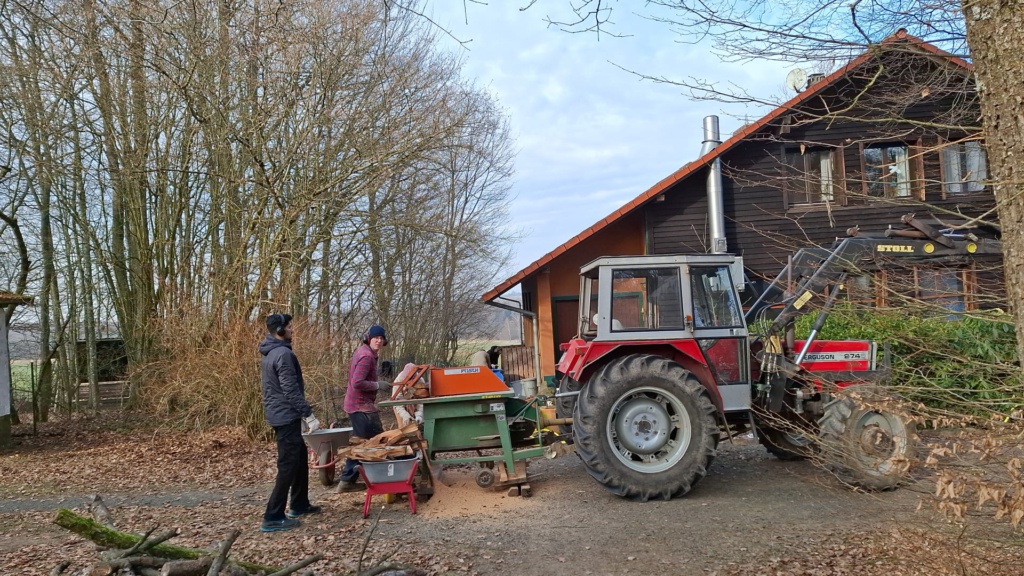 Die Planung stand: Um 9:00 Uhr kam ein wunderbarer Nachbar vom Ort der Meditation mit seinem Frontlader, um Holz von zahlreichen Stellen anzufahren.
